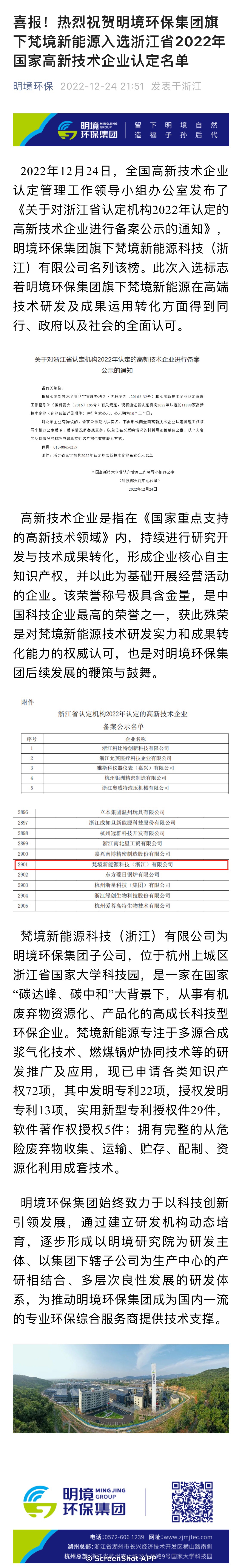 喜報!熱烈祝賀明境環保集團旗下梵境新能源入選浙江省2022年國家高新技術企業認定名單